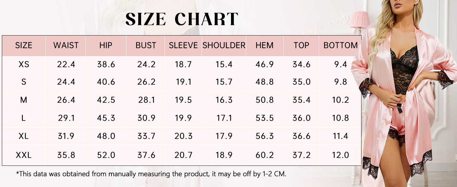 - Features: 4 PCS sleepwear set, include lace lingerie set, satin night robe with belt, and sleep shorts. Comfy Pajama Set for a relaxing day or night.The sexy V neck strap is adjustable.